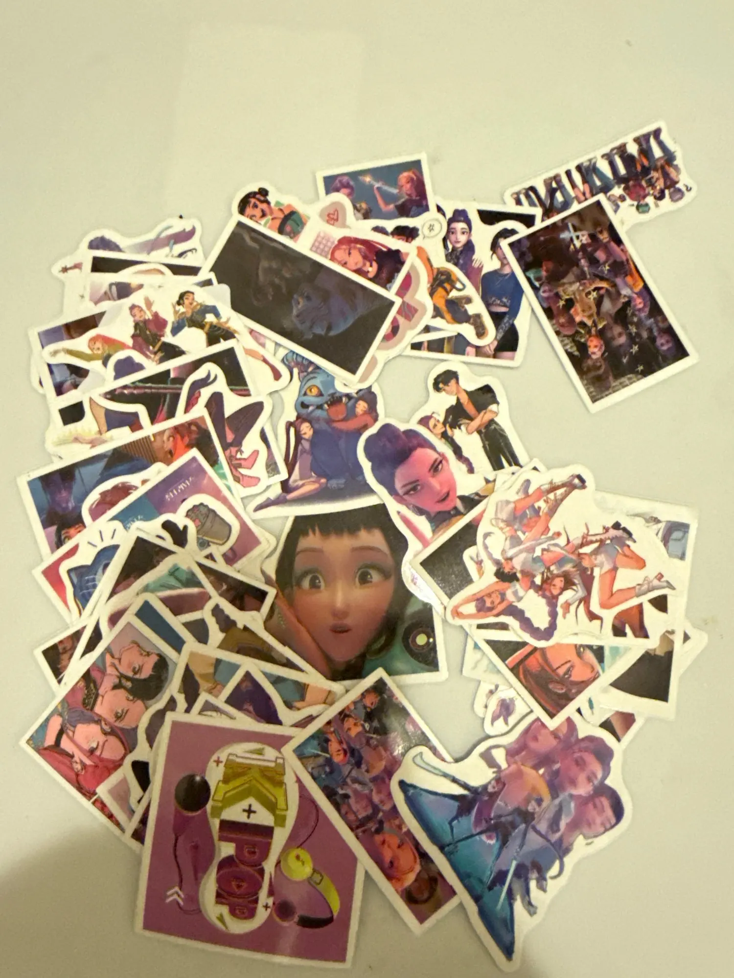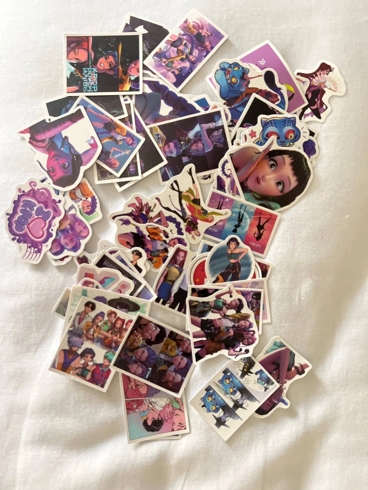 Bring your favorite Demon Hunters aesthetic anywhere you go! This 55-piece sticker set includes characters inspired by Derpys, Tiger, Rumi, Mira, Zoey, Sussy, and more—perfect for fans who love cute, chaotic, and expressive designs.